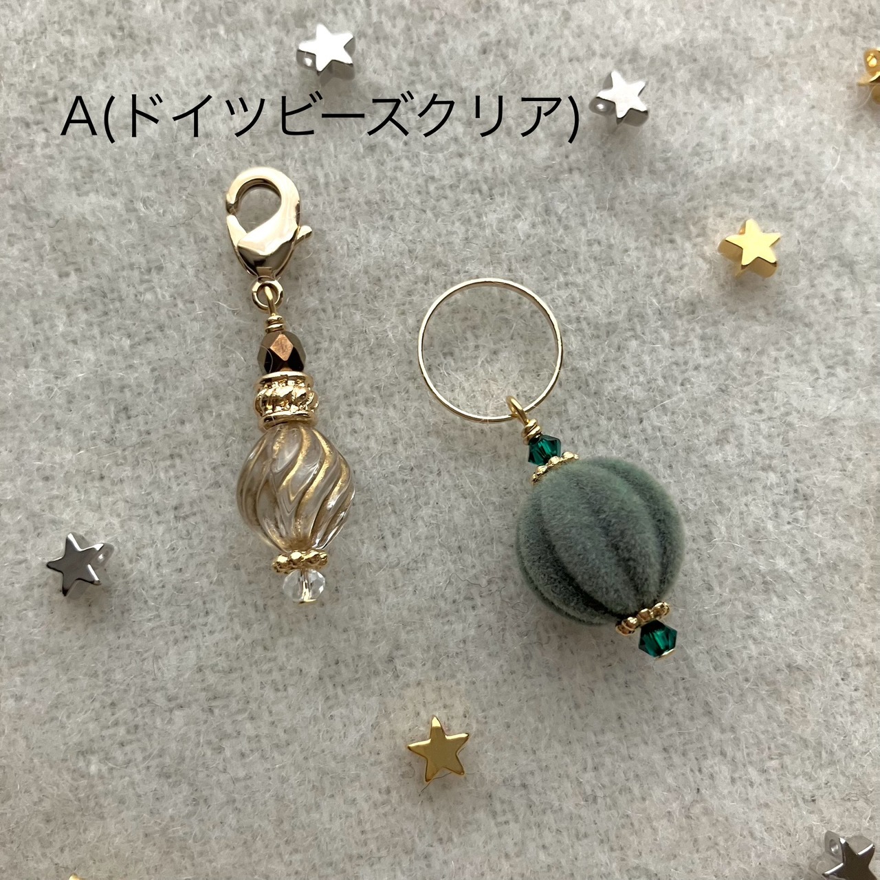 ○カニカンマーカー×1個/ドイツビーズ(クリアorグリーン)、チェコビーズ